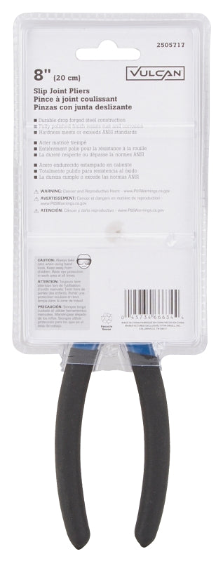 The Vulcan slip joint plier jaw type is double dip and the jaw material is carbon steel with a polished jaw finish. The handle color is black/blue. The OAL is 8 in.