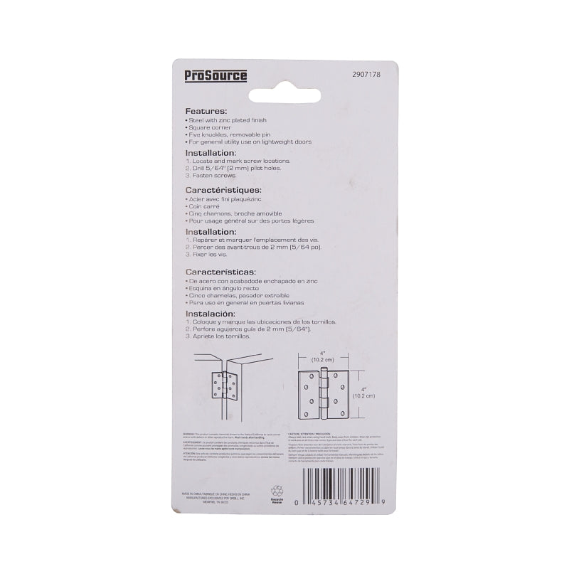 The ProSource utility hinges are constructed of high quality stainless steel ensuring durability and dependability. It has a five knuckle full mortise design and allows for easy installation or removal of lightweight doors. The screws are included.