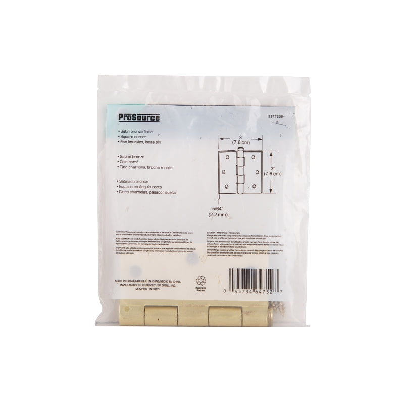 ProSource LR-707-PS Square Corner Door Hinge, Steel, Satin Bronze, Loose Pin, 180 deg Range of Motion
