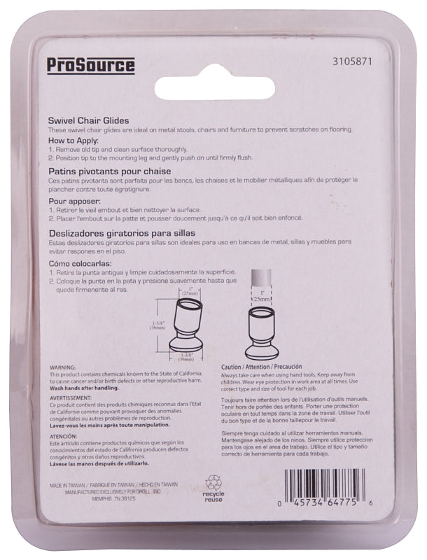 The ProSource furniture glides are ideal for use on furniture legs to help slide furniture over flooring. Not recommended for use on chair legs.
