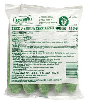 It's no secret that beautiful, healthy trees make your yard look spectacular. Jobe's fertilizer spikes for trees and shrubs ensure a continuous supply of nutrients below the surface, where the trees active roots are growing. Jobe's spikes are easy to insert around each tree's dripline and the slow-release formula lasts all season. No wasteful runoff, no mess, hazards or smells - only a safe beautiful yard. For best results, use Jobe's fertilizer spikes for trees and shrubs in early spring and late fall.
