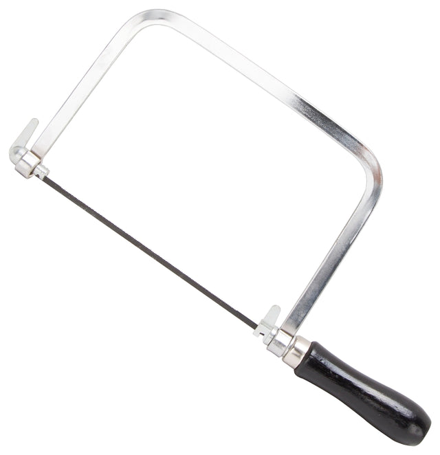 The Vulcan coping saw has a HCS 6 in L blade, steel frame, nickel finish with an adjustable wood handle.