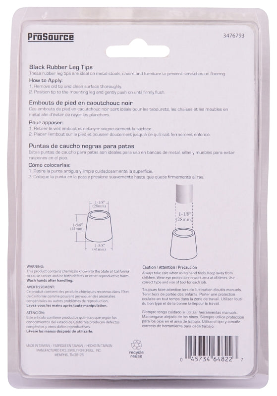 The ProSource leg tip can be used on stools, chairs and furniture legs. It offers scratch protection on your floors and helps to keep furniture in place. The tips are made of non-skid protective rubber.
