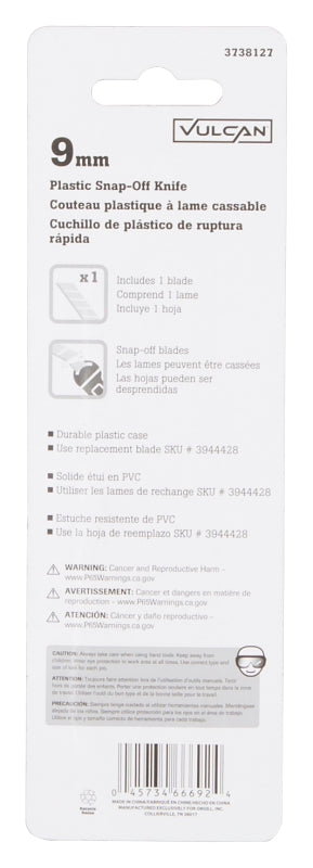 The Vulcan utility knife has a snap-off blade with a plastic handle. The blade is made of carbon steel and the blade dimensions are 3/8 in W. Includes a durable plastic case with a 9 mm replacement blade SKU# 3944428.