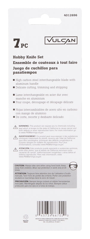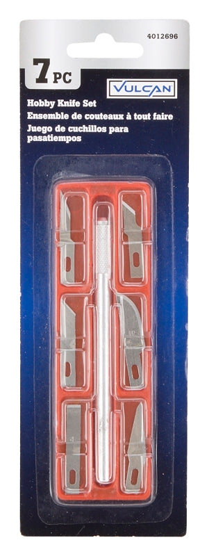 Vulcan Hobby Knife Set, High Carbon Steel Blade, Blade Thickness: 0.4 mm, Number of Blades: 6, Aluminum Handle, Handle Color: Silver, 4 in L Handle, 5-1/8 in OAL, Includes: 6 Blades
