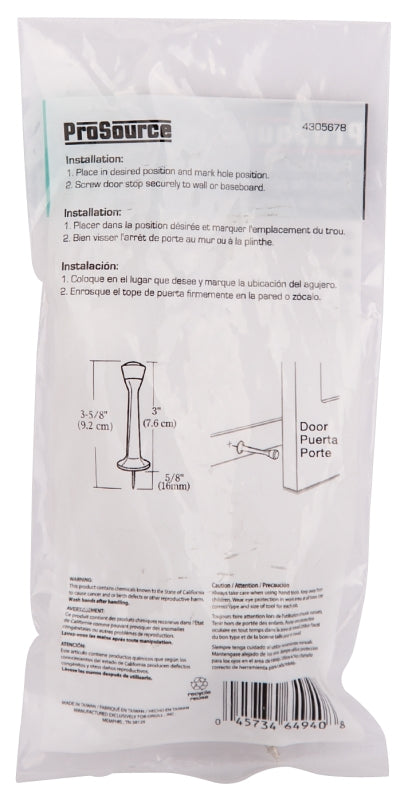 ProSource CL-208P-SN-PS Heavy-Duty Rigid Door Stop, 1 in Dia Base, 3 in Projection, Die-Cast Zinc & Plastic