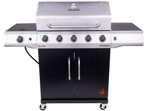 Char-Broil Gas Grill with Chef's Tray, Liquid Propane Gas, 495 sq-in Primary Cooking Surface Area, 2 ft 4 in Cooking Surface Width, 1 ft 5-3/32 in Cooking Surface Depth, 37,500 Btu, 5 Burners, Cast Iron Grate, Cabinet Storage Type, Electronic Ignition, Knob Control, Thermometer Included: Yes, Side Shelf Included: Yes, 900 deg F, Free-Standing Installation, Steel Body, Black/Silver, Dimensions: 3 ft 9-13/32 in H x 4 ft 5-11/16 in W x 1 ft 8-3/32 in D