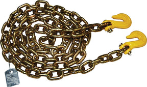 Ancra's grade 70 XHD 3/8 in x 10 ft chain assembly is an ideal choice for heavy-duty tie-down tasks. Built with strong carbon alloy steel and finished with zinc-plated gold chromate for resistance against rust and corrosion, the chain assembly is extremely durable. Having been heat-treated, the assembly is also 100% proof-tested to twice its original working load limit for a total WLL of 6600 lb. Oversized grade 80 clevis hooks provide improved strength over grade 70 construction and are similarly heat-treated for improved performance, while increased material in the neck of the hook helps to reduce cracking due to trapped side pulls. The grade 70 XHD 3/8 in x 10 ft chain assembly with grade 80 clevis hooks is made to NACM standards per specifications of the Department of Transportation and CCMTA for tie-down use with properly marked links and aluminum tags with stamped WLL information.
