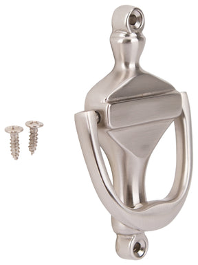 Upgrade and enhance your home with this simple and affordable door knocker. Constructed of Satin Nickel that will give you the very best in corrosion resistance and a long lasting finish.