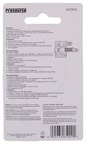 ProSource LR-002BB-PS Door Viewer, 200 deg Viewing, 1-3/8 to 1-3/4 in Thick Door, Solid Brass, Brass is backordered and will ship as soon as it is back in stock.