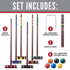 - Includes: (9) All Weather Coated Wickets (6) All Weather Molded Balls (6) Wood Mallets (2) Wood Stakes