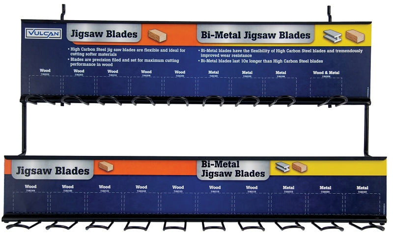 The Vulcan jig saw blade rack is made of metal, has 2-tiers and 19 slots. It's perfect for safely storing your jig saw blades.