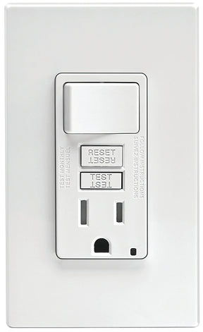 SmartlockPro slim GFCI combination switch. Tamper-resistant receptacle with LED indicator. 15 A, 125 V. Switch 1800 W, 120 VAC. Monochromatic, back and side wired, wallplate/faceplate sold separately, self-grounding clip included, white. Peace of mind, all the time. The SmartlockPro self-test GFCI tests itself even if you forget. Designed to meet the latest UL standard for auto-monitoring (self-test) our complete line of self-test GFCIs periodically conduct an automatic internal test to confirm that it can respond to a ground fault. With the slimmest profile on the market, the device allows for fast and easy installation, while Leviton's patented reset lockout mechanism prevents reset of the GFCI if it is not wired or operating correctly. The SmartlockPro self-test GFCI is the smart choice in ground fault circuit interrupter protection.