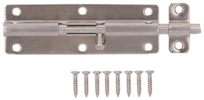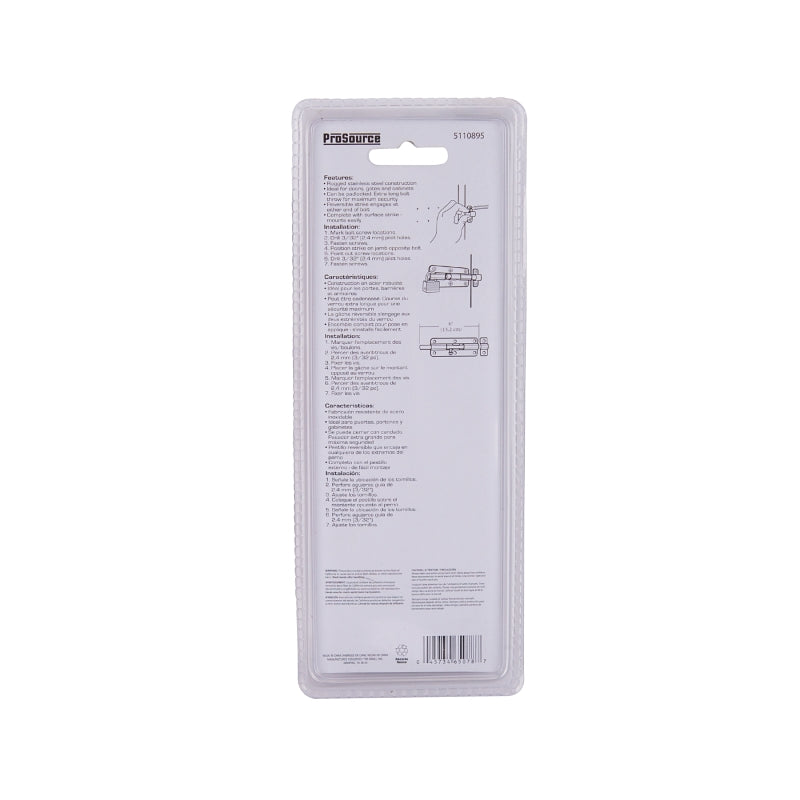 ProSource Barrel Bolt, Bolt Head Size: 0.31 Dia in, Bolt Length: 6 in, Throw Size: 1.25 in, Stainless Steel, Stainless Steel, Number of Mounting Holes: 6+2, 4.62 in L, 1.51 in W, 0.51 in H, Includes: Screws