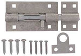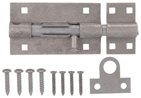 ProSource Padlockable Barrel Bolt, Bolt Head Size: 0.31 Dia in, Bolt Length: 6 in, Throw Size: 1.83 in, Galvanized Steel, Galvanized Zinc Plated, Number of Mounting Holes: 4+4, 4.57 in L, 2.7 in W, 0.9 in H, Includes: Fasteners