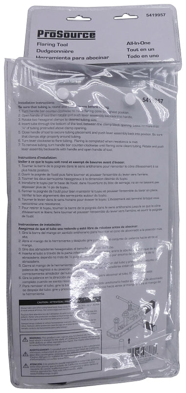 This ProSource flaring tool is faceted and made of hardened steel. It automatically burnishes flare face reducing the need for deburring. The original wall thickness is maintained at base of flare. The larger handle, with better leverage, and precision threads on feed screw make flaring effortless. Has heat treated dies grip tubing without scoring.