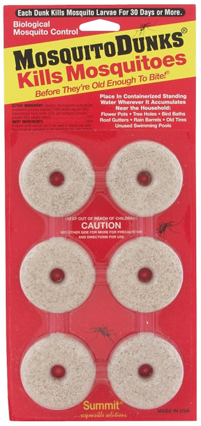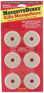 Kills Mosquitoes before they're old enough to Bite! The Mosquito Dunks are America's excellent selling home owner mosquito control product. The only product with BTI, a bacteria toxic only to mosquito larvae, that lasts 30 days and treats 100 sq-ft of surface water.