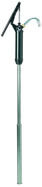 Two-piece telescoping suction tube fits 30 to 55 gal drums for a wide variety of liquids. Easy-to-operate suction lift dispenses approximately 10 oz per stroke. Complete with standard bung adapter, tough all steel foot valve and piston valve. Standard garden hose thread discharge spout.