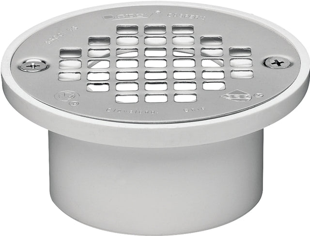 Oatey 43579 Floor Drain, 3 x 2 in, White, 4.3 in OD, Solvent Weld, PVC Body