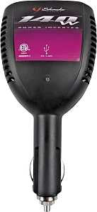 Converts 12 VDC power to 110 VAC household electrical power. 140 W continuous/280 W peak. Fits into glove box or briefcase. Single 110 VAC household outlet. LED correct-connection indicator. Surge protection against damaging current fluctuations.
