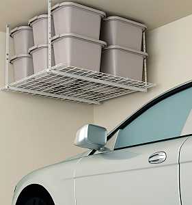 - Ceiling storage unit helps get items off-the floor and out-of your way