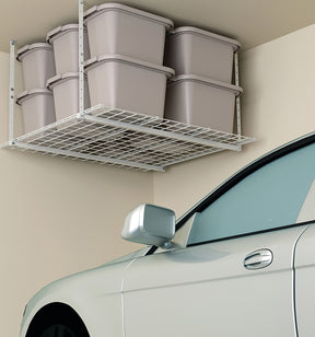 - Ceiling storage unit helps get items off-the floor and out-of your way