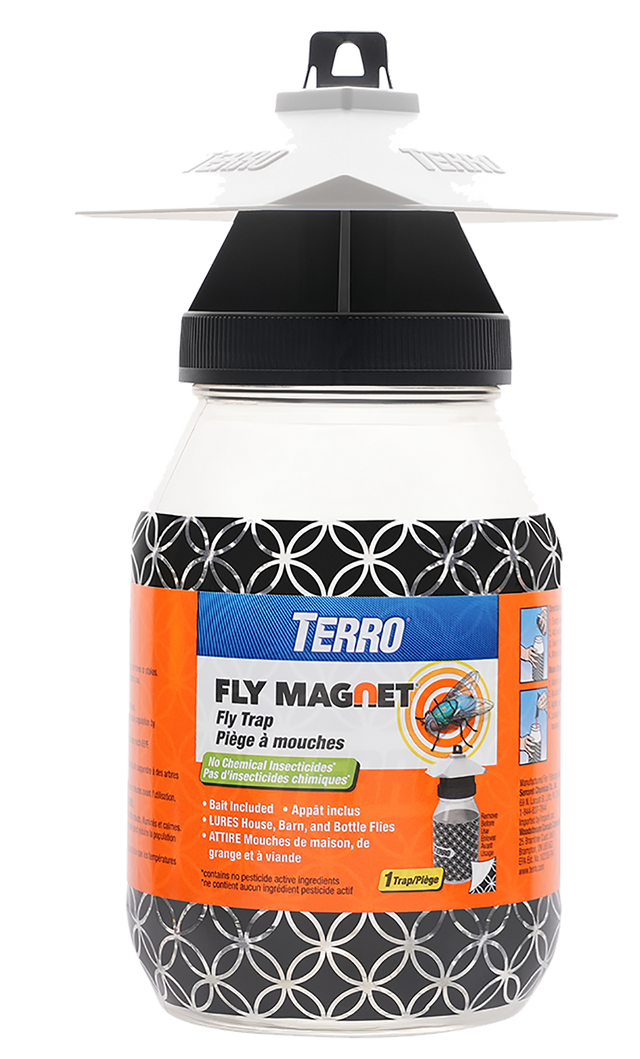 Keep your outdoor space free of nuisance flies with the TERRO Fly Magnet fly trap. Eliminating just one female fly can reduce the population by 150 to 500 flies per year. This trap attracts and kills a variety of common flies, including house flies, barn flies and bottle flies, to drastically reduce fly populations around your home. It's also easy to set up - just add the included bait to the trap, fill with water and hang.
