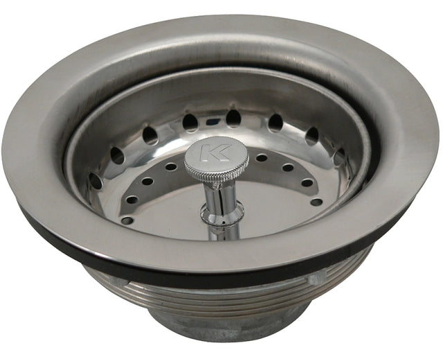 Stainless steel body with cut threads, die-cast slip nut and rolled edge basket. Chrome-plated plastic fixed stick post. 1-1/2 in x 4 in CP. Tailpiece. For 3-1/2 in Dia opening. Boxed.