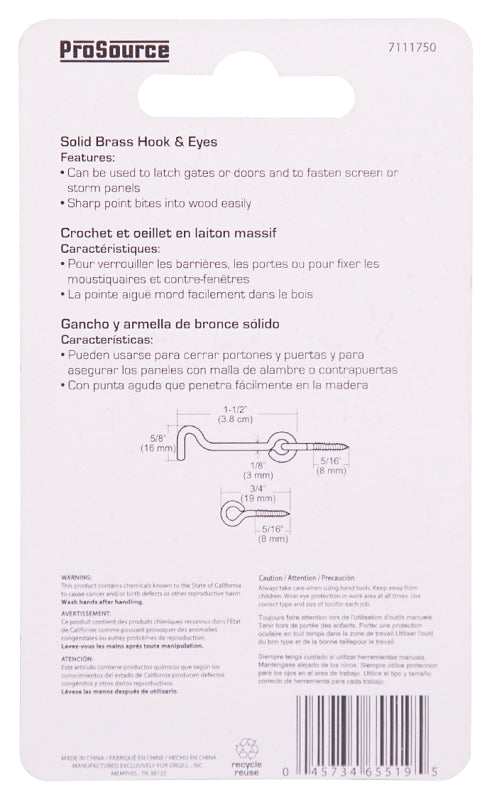 ProSource LR-414-PS Gate Hook and Eye, 1/8 in Dia Wire, Solid Brass