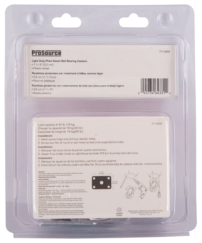 ProSource JC-B03-PS Swivel Caster, 1-1/4 in Dia Wheel, 16 mm W Wheel, Plastic Wheel, White, 40 lb