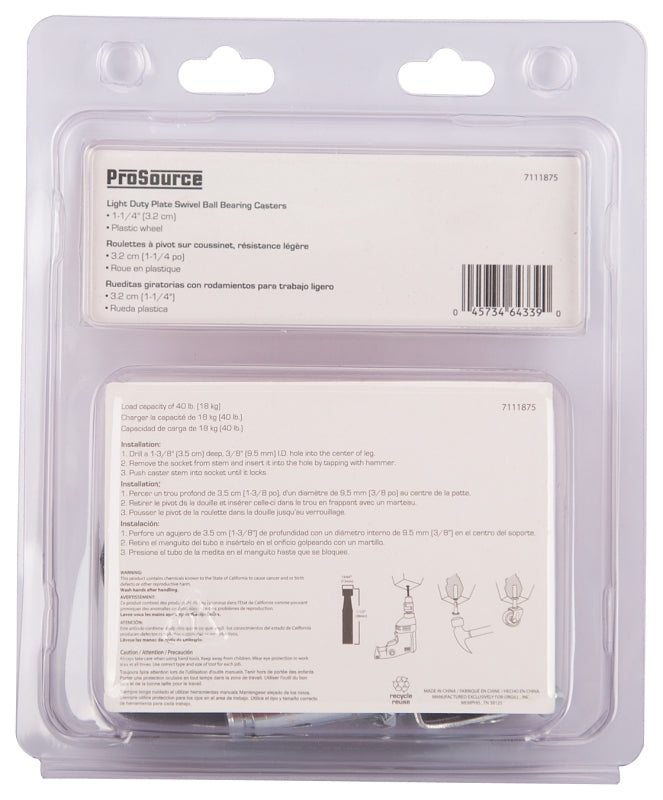 ProSource JC-B05-PS Swivel Caster, 1-1/4 in Dia Wheel, 1-1/4 in W Wheel, Black, 40 lb, Steel Housing Material