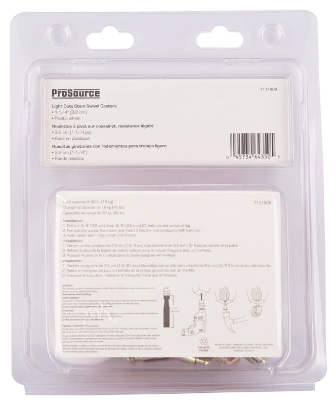 ProSource JC-B08-PS Swivel Caster, 1-1/4 in Dia Wheel, 1-1/4 in W Wheel, White, 40 lb, Steel Housing Material