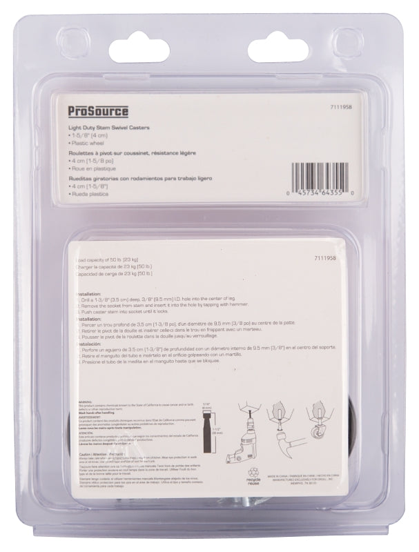 ProSource JC-B13-PS Swivel Caster, 1-5/8 in Dia Wheel, 1-5/8 in W Wheel, Black, 50 lb, Steel Housing Material
