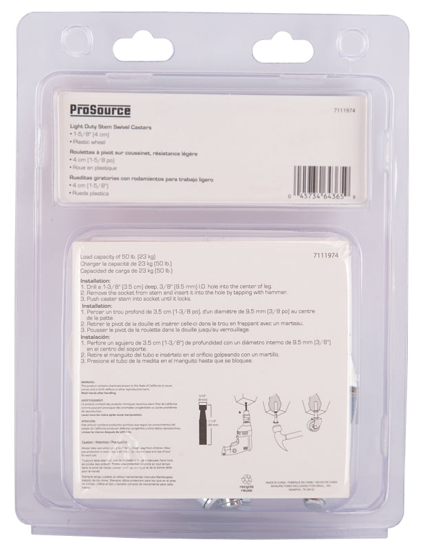 ProSource JC-B15-PS Swivel Caster, 1-5/8 in Dia Wheel, 1-5/8 in W Wheel, White, 50 lb