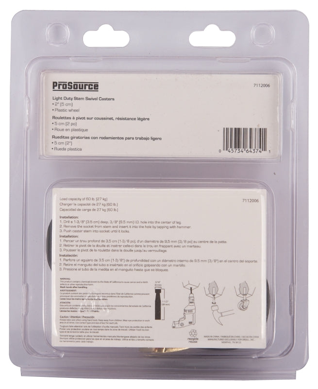 ProSource JC-B23-PS Swivel Caster, 2 in Dia Wheel, 2 in W Wheel, Black, 60 lb, Steel Housing Material
