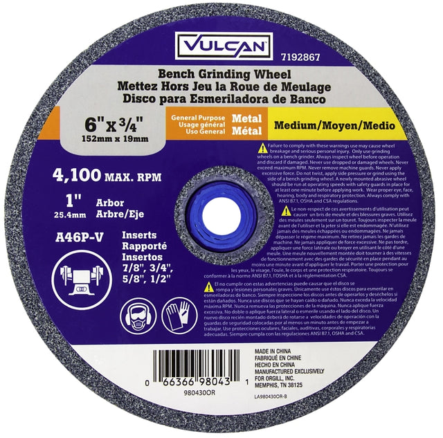 Vulcan 980430OR Straight Bench Grinding Wheel, 6 in Dia, 1 in Arbor, 45 Grit, Medium, Aluminum Oxide Abrasive is backordered and will ship as soon as it is back in stock.