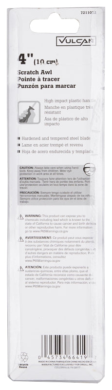 Vulcan JLO-024 Scratch Awl, 5.8 mm Dia Shank, 4 in L Shank, 7-1/8 in OAL, Ergonomic Handle, Plastic Handle, Steel Shank