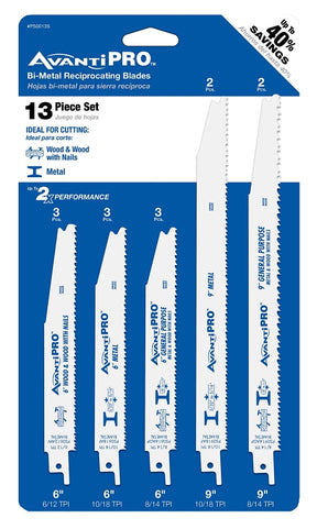 Avanti Pro Reciprocating Saw Blade Set, Bi-Metal, 13 Piece, Includes: (3) 6 in 6/12 TPI Blades, (3) 6 in 10/18 TPI Blades, (3) 6 in 8/14 TPI Blades, (2) 9 in 10/18 TPI Blades, (2) 9 in 8/14 TPI Blades