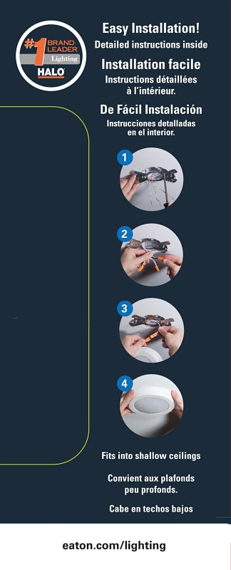 Halo BLD4 Downlight, 120 V, 0.087 A, Wattage Rating: 10 W, Trim Type: Surface Mount, Lamp Base: E26 Edison Screw, Lamp Type: LED, Surface Mounting, Ceiling Type: Recessed, Average Life: 50000 hr, Lumens: 800 Lumens, Color Temperature: 2700, 3000, 3500, 4000, 5000 K, Color Rendering Index (CRI): 90, Aluminum, Bright White/Daylight/Neutral White/Soft White/Warm White, Dimensions: 6-3/16 in Dia x 7/8 in H