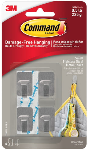 Command 17031SS-4ES Small Hook, 0.5 lb, 4-Hook, Metal, Gray, Stainless Steel, Pack of 4