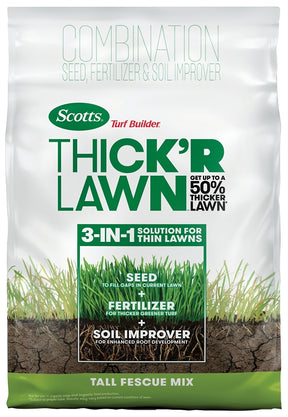 Scotts Turf Builder Thick'R Lawn tall fescue mix has everything you need to help turn weak, thin grass into a thicker, greener lawn. With this 3-in-1 solution get up to a 50% thicker lawn with just one application, guaranteed. Thick'R Lawn contains soil improvers for enhanced root development, seed to fill gaps with new grass and fertilizer to feed new grass and thicken and green existing turf. This product is intended for use on an entire lawn and can be applied easily with a Scotts spreader.