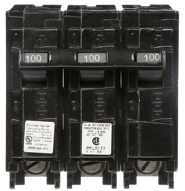 Siemens Circuit Breaker, Low Voltage, Mini, Standard, 240 VAC, 100 A, 3 ph, 3 Pole, 10 kA Interrupt, QP, MP Frame, Toggle Actuator, Common Trip, 8 to 2 AWG Wire, Lug Terminal, Plug Mounting, Dimensions: 2 in H x 3 in W x 3 in D, 40 deg C Operating, Suitable for: Siemens EQ Load Center