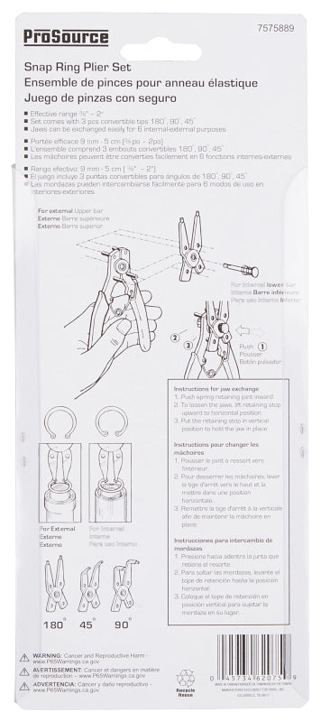 The ProSource snap ring plier set can change easily from internal to external rings. It has a heavy duty return spring. The effective range of 3/8 to 2 in for 6 Internal/External purposes. Includes three convertible tips, 180 deg, 90 deg and 45 deg.