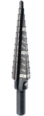 Our line of step drill bits far surpasses the competition. With our single cutting edge design, you will have more control and a cleaner finish. Made of high-speed steel, these new step drill bits are durable and designed to drill through most metals. The black oxide finish prevents corrosion and has great capacity to work with drilling lubricants. The new speed start tip prevents bit walking and allows faster penetration. With laser etched markings you will always know your hole sizes...no guess work! Finally, the 1/4 in hex shank allows for fast bit change in impact drivers and sure grip in chucks.
