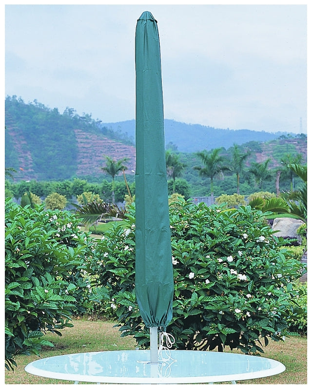 Embossed green vinyl for all-season protection from weathering and discoloring. Zip and drawstring for quick and easy placement, fastening cord holds cover in place. Fits most sizes of umbrella.