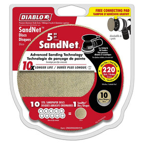 Diablos new SandNet discs are the most advanced sanding technology on the market with 10X longer life versus standard sanding discs. Each SandNet discs features a clog-reducing net design coated in premium aluminum oxide grit for fast material removal while reducing material build-up. The SandNet design is easy to clean and reuse multiple times by simply shaking, vacuuming or rinsing the disc to remove any build up. The 10 pack of SandNet discs includes a free connection pad for easy attachment to tool. Ideal for sanding wood, metal, plastic and solid surfaces.