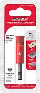 Diablo's high-performance diamond grit hole saws deliver longer life and faster material removal when boring holes into tile, stone and glass. A continuous rim diamond grit edge delivers lasting durability and maximizes cut quality in masonry applications. An integrated wax lubricant cools the cutting edge and reduces friction and heat build-up while drilling holes. Diablo's hole saws are compatible with Diablo's SnapLock PLUS mandrel system, resulting in quick, easy and effortless cup changes.