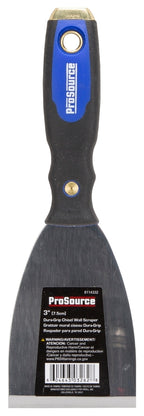 The ProSource wall scraper is made from full tang construction and high-carbon steel with a mirror finished blade. The ergo-engineered soft-grip handle absorbs shock and reduces worker fatigue and the brass rivet holds the blade more securely inside the handle.