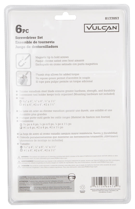 The Vulcan 6 PC Screwdriver Set features heat-treated, chrome vanadium steel blades for increased durability. A comfort optimized handle is ideal for high and low torque applications. Blades and shafts are chrome plated.