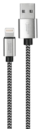 Lightning charging cable for charging and data syncing. 5V input, 2A output. 6ft (200cm) length. Made of braided cable + aluminum. Black + white color.